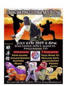 Join us again for the 22nd annual Zhang San Feng Cultural Arts Festival – July 6th and 7th, 2019 – to experience a “taste” of China. Elks Lodge 3690 South Jason Street, Englewood Colorado 8:00 am – 4:00 pm
